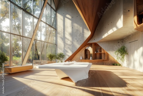 © mochalfin, Obraz premium Modern wooden & concrete building interior, sunlight streaming through large windows, showcasing a sculptural table, serene forest backdrop
