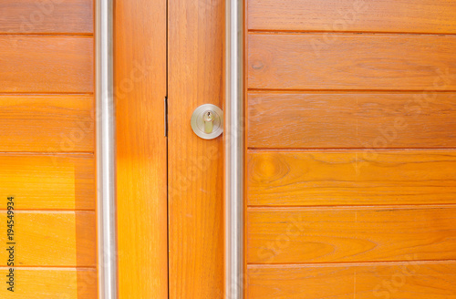 Fototapeta premium Modern wooden doors and door handles are made of stainless steel with sunshine in the morning. Vintage Style