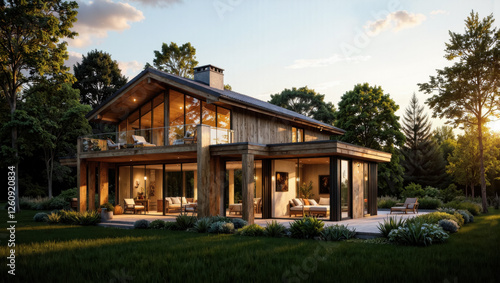 © Юлия Падина, Obraz premium Modern wooden house in scenic natural setting at sunset