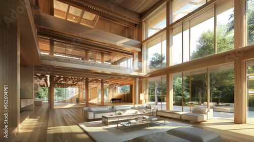 Fototapeta premium Modern Wooden House Interior Design with Large Windows