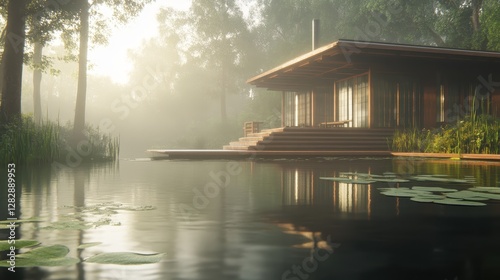 Obraz premium Modern Wooden House on Misty Lake in Forest