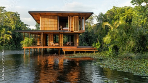 Obraz premium Modern wooden house perched above calm waters, surrounded by lus