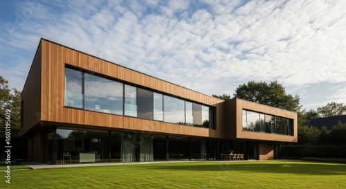 © Rakibul, Fototapeta premium Modern wooden house with large glass windows and green lawn