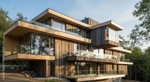 Obraz premium Modern Wooden House With Large Glass Windows Surrounded By Green Trees Under Clear Blue Sky