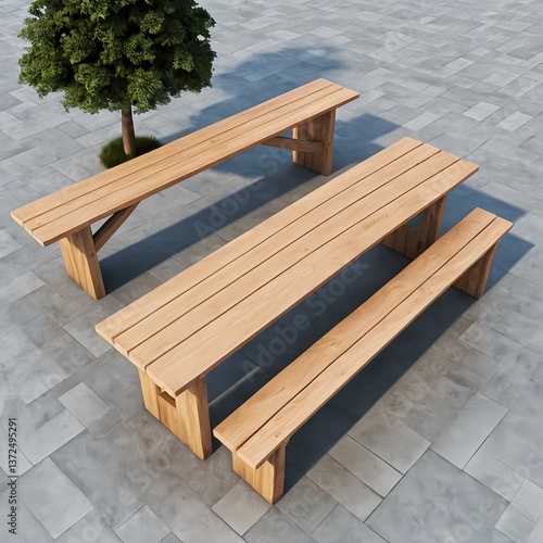 Fototapeta premium Modern Wooden Outdoor Picnic Table and Benches Set on Patio