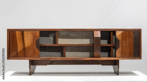Fototapeta premium Modern wooden sideboard with geometric design and glass panels, perfect for...