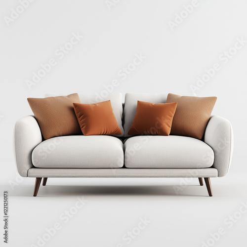 © 수동 김, Fototapeta premium Modern wooden sofa with light gray cushions on a white background, front view.