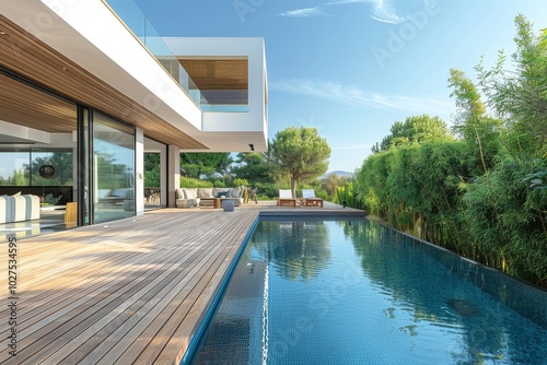 © JIALU, Fototapeta premium Modern wooden terrace with swimming pool, bamboo bushes, and garden furniture under blue sky. Clean design and serene outdoor space.