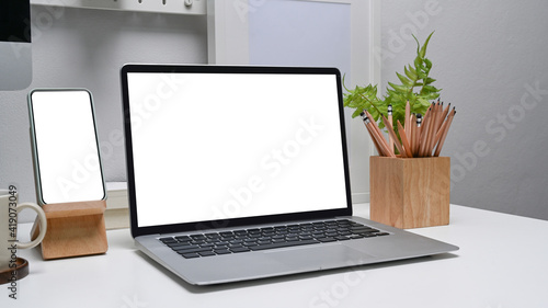 Fototapeta premium Modern work place with computer laptop and smart phone with blank screen on white desk.