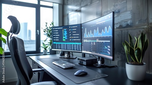 © kampret 99, Naklejka premium Modern Workplace Setup with Dual Monitors Displaying Financial Data