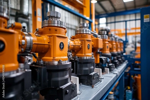 © Віталій Б., Fototapeta premium Modern workshop with orange and black machines in a busy factory. Generative AI