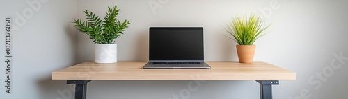 Fototapeta premium Modern workspace featuring a laptop on a wooden desk with potted plants for a...