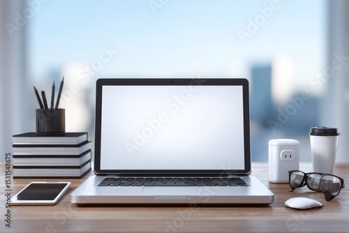 Fototapeta premium Modern workspace featuring a laptop with a blank screen, books, pencils,...