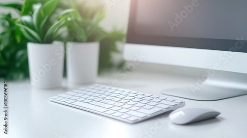 © Phirakhup, Fototapeta premium Modern workspace with a computer, keyboard, and green plants on a bright desk.