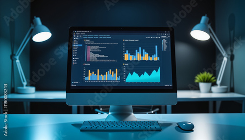 Naklejka premium Modern workspace with computer displaying data analysis charts and AI algorithms in soft, cool light