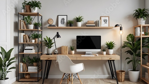 Fototapeta premium Modern Workspace with Wooden Desk and Plant Decor