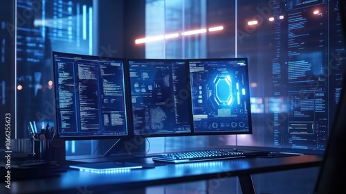 © vanzerim, Obraz premium Modern Workstation with Triple Monitors Displaying Data and Code