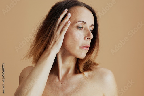 Obraz premium modern 40 years old woman with short hair on beige background