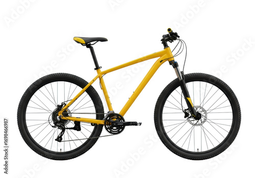 © Anna, Obraz premium modern yellow mountain bike with knobby tires, black/yellow seat, silver components, in pristine studio on transparent background with copy space, subtle shadow. concept for outdoor sports advertising