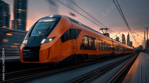 Naklejka premium Modern Yellow Passenger Train Moving Through City at Sunset