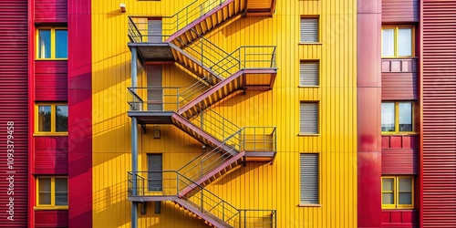 Fototapeta premium Modern, yellow-toned building; a fire escape, architectural artistry.