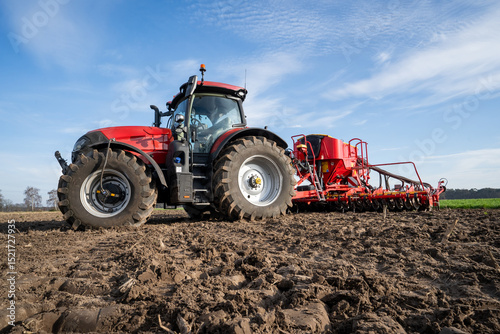 © Countrypixel, Fototapeta premium Moderne Direktsaat - Drillmaschine am Vorgewende eines Feldes im Einsatz, Nahaufnahme.