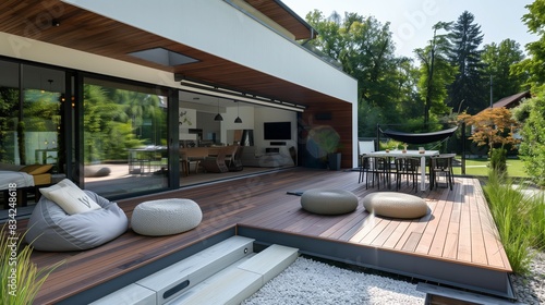 © Business Image, Fototapeta premium Moderne Hausfassade mit schlankem Landschaftsdesign