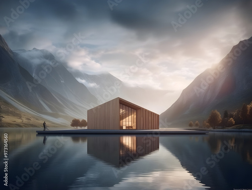 © Chris, Fototapeta premium Modernes schwimmendes Haus auf ruhigem See inmitten der Berge - Ai-Ki generiert