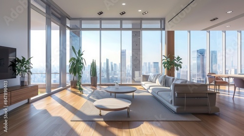 Fototapeta premium modernist apartment with minimalist decor, large windows, and city views