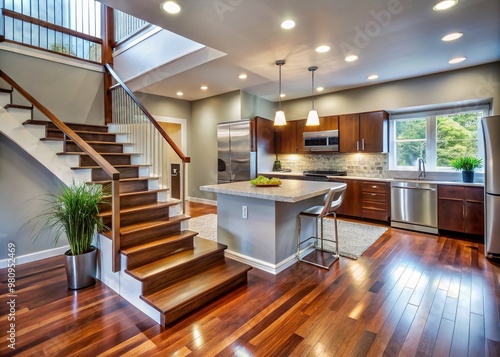 © Sirinporn, Fototapeta premium Modernized split-level home with sleek staircase, refinished hardwood floors, and updated kitchen featuring sleek