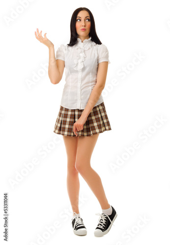 Fototapeta premium Modest girl in plaid skirt