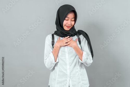 © Saddha Visual, Obraz premium Modest Muslim student wearing a hijab and backpack, smiling gratefully with hands on chest. Back to school concept, expressing humility and enthusiasm in a studio shot.