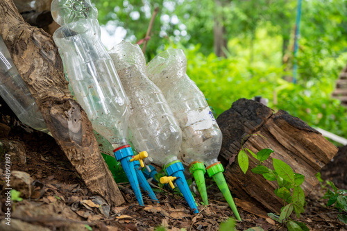 © karunyapas, Obraz premium Modified plastic bottles for automatic watering of plants.