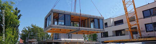 © Chanoknan, Obraz premium Modular home construction site with a crane lifting a prefabricated house section into place on a sunny day.