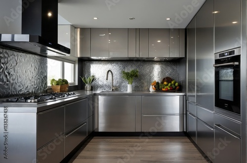 © DARPANA, Fototapeta premium Modular Modern Metallic Silver Kitchen Design With A High Gloss Finish