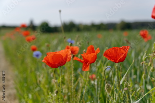 Fototapeta premium Mohn, Klatschmohn, Poppy, rote Mohnblumen am Feldrand