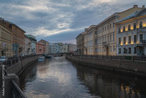 © Ula Ulachka, Naklejka premium Moika River Embankment and Bolshoy Konyushenny Bridge on a cloudy spring morning, Saint Petersburg, Russia