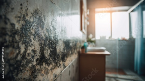 Obraz premium Mold growth on bathroom wall near window during evening light hours showing...