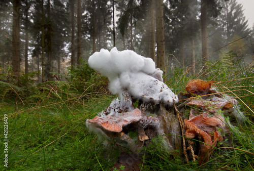 © Matauw, Obraz premium Moldy mushroom, a Freckled dapperling, growing on a rotting tree trunk in a forest