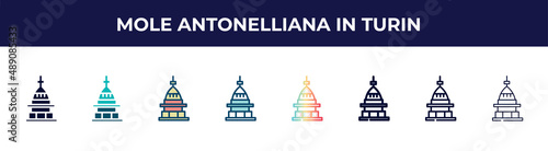 Naklejka premium mole antonelliana in turin icon in 8 styles. line, filled, glyph, thin outline, colorful, stroke and gradient styles, mole antonelliana in turin vector sign. symbol, logo illustration. different