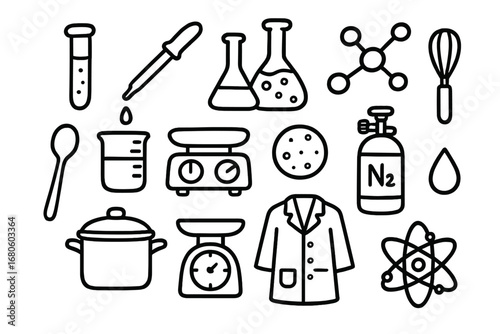 © Coosh448, Obraz premium Molecular Gastronomy Icons. Hand-drawn doodle illustration Molecular gastronomy test tube, pipette, flask, molecular structure,