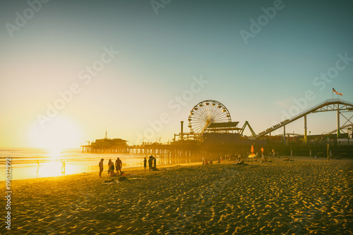 © chones, Fototapeta premium Molo na plaży w Santa Monica w Kalifornii w USA o zachodzie słońca. Kolory retro