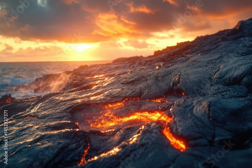 © Thimira, Fototapeta premium Molten lava flows across dark volcanic rock at sunset, meeting the ocean waves.
