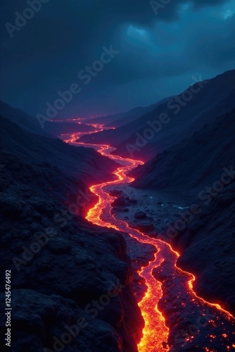 Fototapeta premium Molten lava flows beneath a deep blue sky on a dark background, fiery depths,...