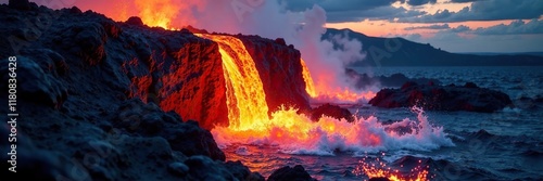 © Sarayuth, Fototapeta premium molten lava flows down a black volcanic rock cliff, lava, natural wonder
