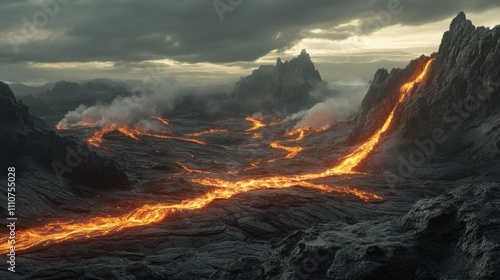 Fototapeta premium Molten lava flows through a rugged volcanic landscape under a dramatic cloudy...