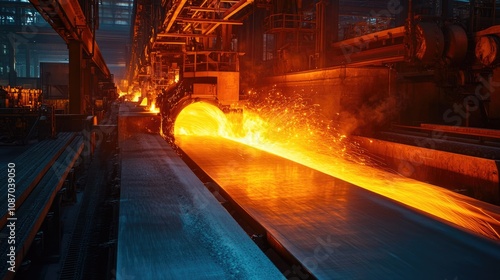 © Horsi, Naklejka premium Molten Metal Streaming Through Industrial Conveyor Belt