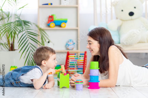 Fototapeta premium mom and baby boy play at home with educational toys in the children's room. A happy, loving family.