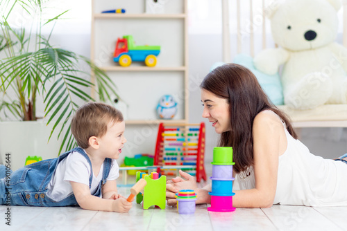 Fototapeta premium mom and baby boy play at home with educational toys in the children's room. A happy, loving family.