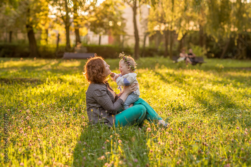 © Svitlana, Fototapeta premium Mom and baby in a summer Park at sunset.
